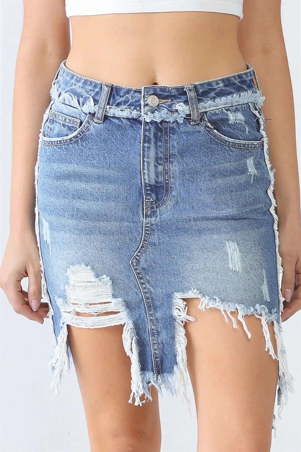 Denim Five Pocket Trim Torn Hem High Waist Mini Skirt