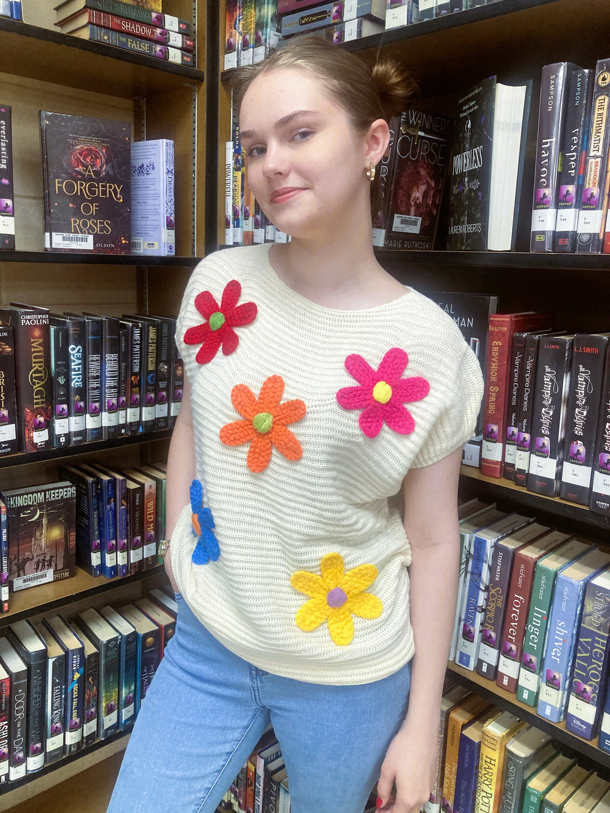 Floral Crochet Short Sleeve Knit Top - Loose Fit, with Colorful Flower Appliqués, Lightweight & Breathable for Spring/Summer.