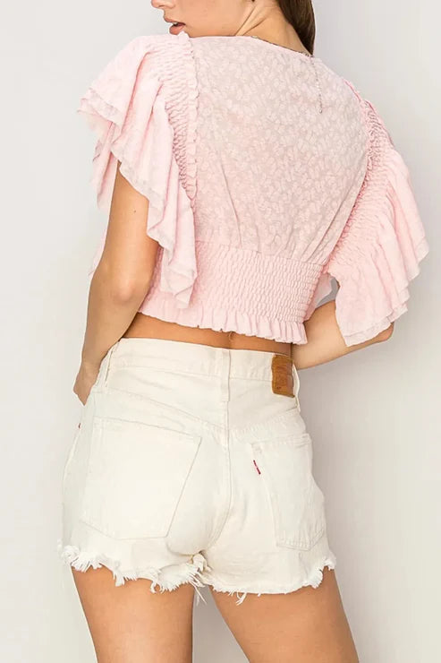 Short Ruffle Sleeve Front Button Smocked Lace Crop Top